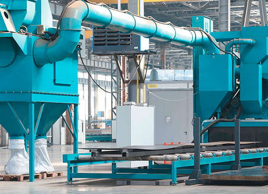 Дробеметная обработка сварных металлических рамных конструкций проходит на современных установках (производство Италия) с использованием стальной колотой дроби. Данная технология предварительной обработки стали позволяет достичь идеальной очистки поверхности перед окрашиванием. Дробеметная установка хорошо удаляет оксид металла, окалину и всевозможные загрязнения, что важно для надежного нанесения порошковой полиэфирной краски.